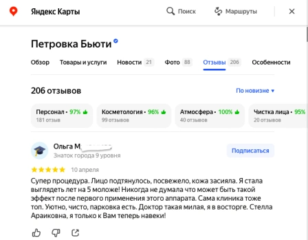 "Супер процедура. Лицо подтянулось, посвежело, кожа засияла. Я стала выглядеть лет на 5 моложе! Никогда не думала что может быть такой эффект после первого применения этого аппарата. Сама клиника тоже топ. Уютно, чисто, парковка есть. Доктор такая милая, я в восторге. Стелла Араиковна, я только к Вам теперь навеки!"