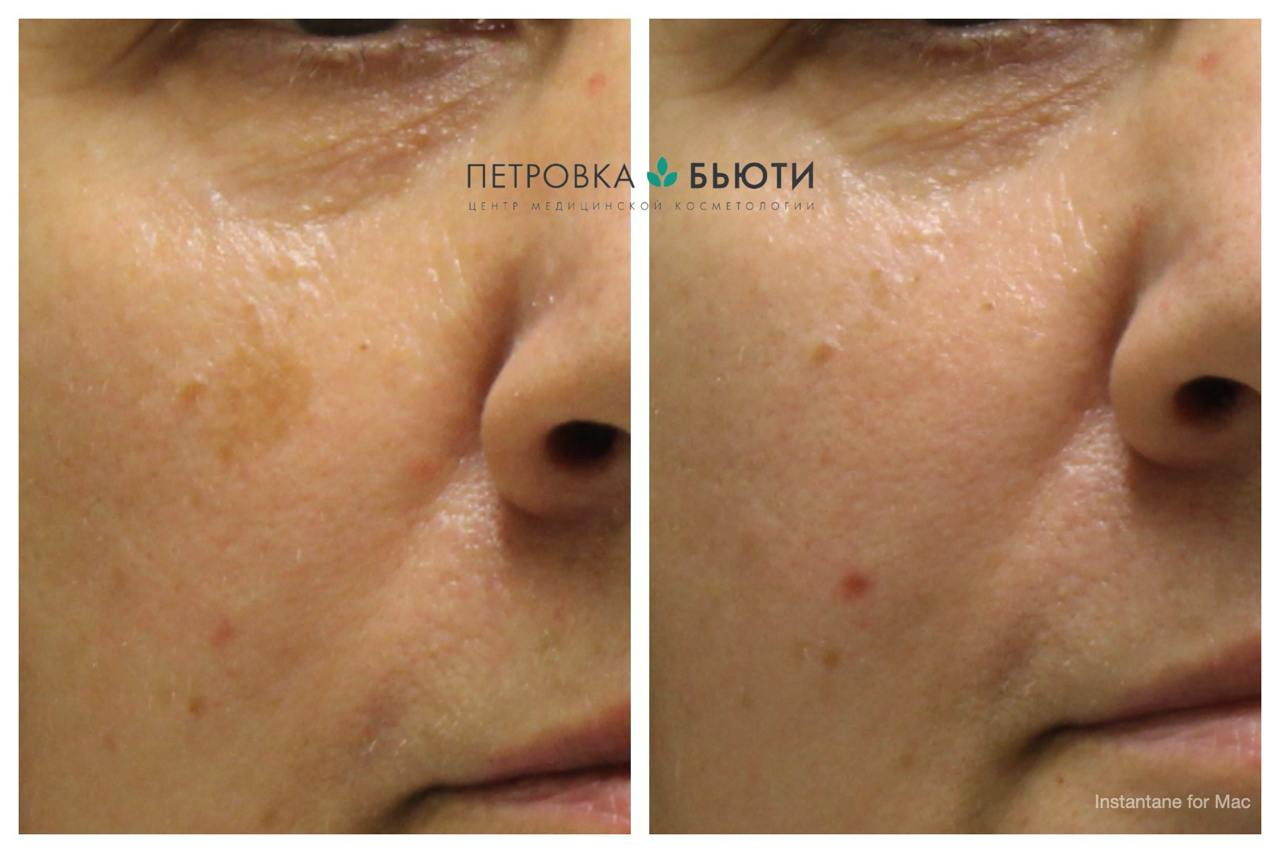 После удаления пигментное пятно заживало с образованием корки, появилась она на второй день, а через неделю отошла. Это нормальный процесс заживления. Пациентка использовала SPF-40 средство TiZO Ultra Zinc каждый раз перед выходом на улицу.