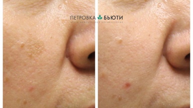 Появление пигментного пятна на щеке пациент связывает с проблемой с поджелудочной 3 года назад. SPF средствами не пользовалась, ввиду работы в то время на солнце была очень редко, не загорала. Пигмент появился не сразу темным, изменялся цвет с течением времени.