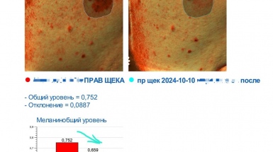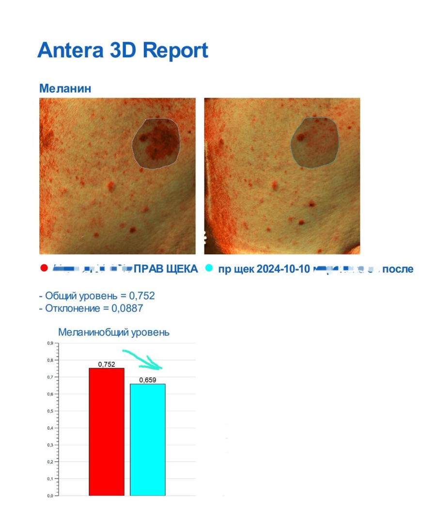 На фото до-после с диагностического аппарата Antera видно, что общий уровень меланина понизился на обработанном участке.