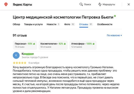 "Хочу выразить огромную благодарность врачу косметологу Громыко Наталии. Понадобилась только одна процедура, чтобы решить мою давнюю проблему- это пигментное пятно на лице, оно очень меня расстраивало, т.к. прибавляет непроизвольно года. В беседе она пояснила, что в первый раз, не стоит давать сильный тепловой импульс, возможно понадобится ещё одна процедура через месяц. К счастью, на второй день после процедуры пятно потемнело, через неделю полностью отшелушилось. У Наталии легкая рука. Процедуру провела на высоком уровне и дала рекомендации."