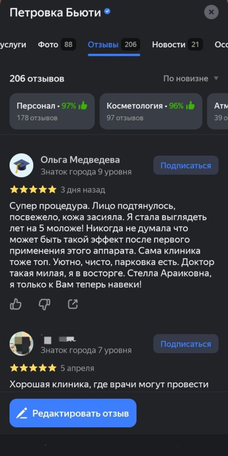 Моя первая серьезная процедура (помимо чисток и эпиляции) в косметологии - это фототерапия. Стелла Араиковна объяснила, почему стоит сделать эту процедуру именно сейчас, подобрала подходящие параметры и зафиксировала фото "до" для фиксации результатов. Знаю, что процедура курсовая, делаю её для того, чтобы поработать с сосудами, для этого в клинике целый протокол есть. На инъекции пока не решаюсь, но аппараты, клиника и врачи вполне заслуживают доверия. Спасибо, доктор Стелла.