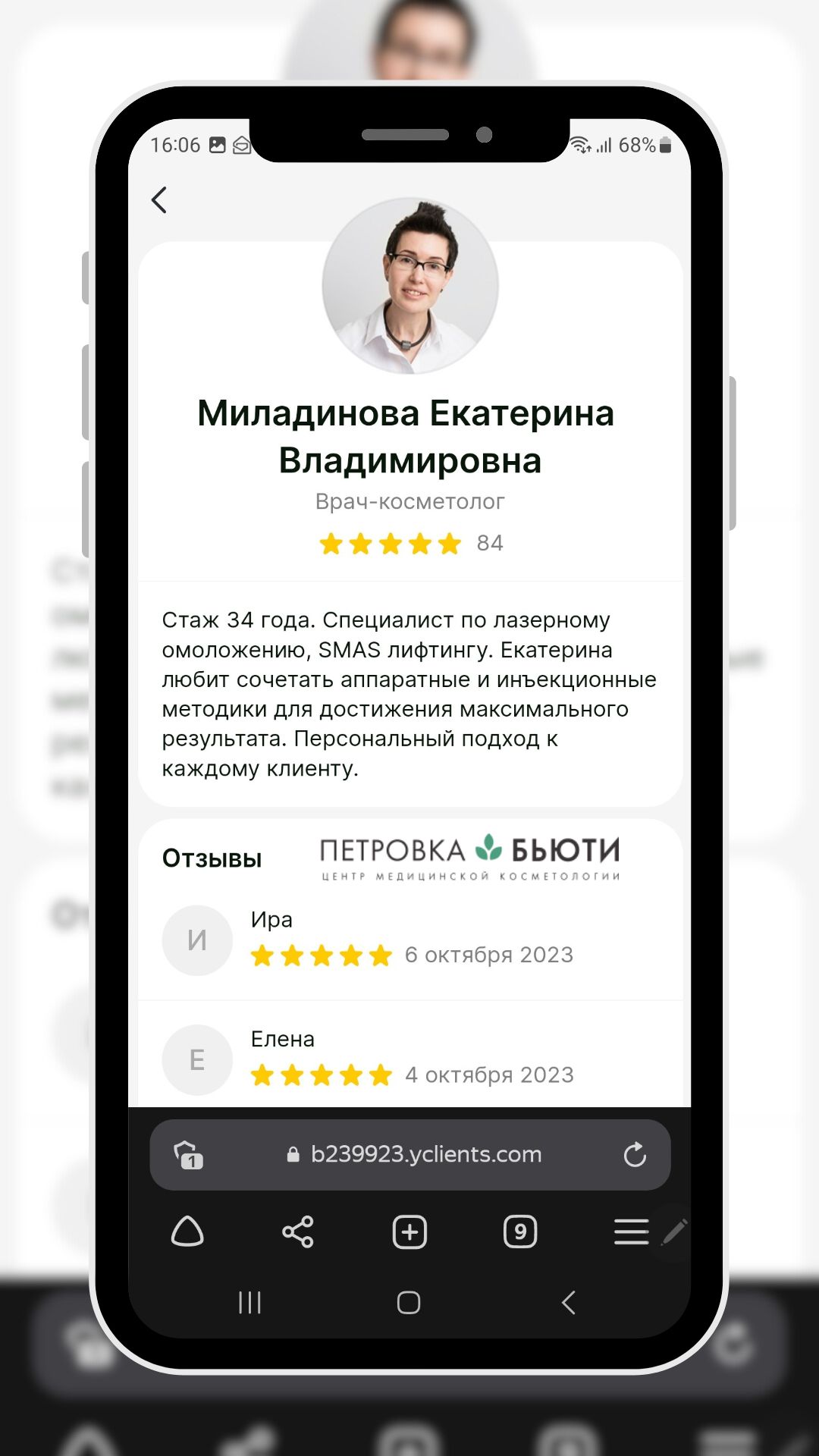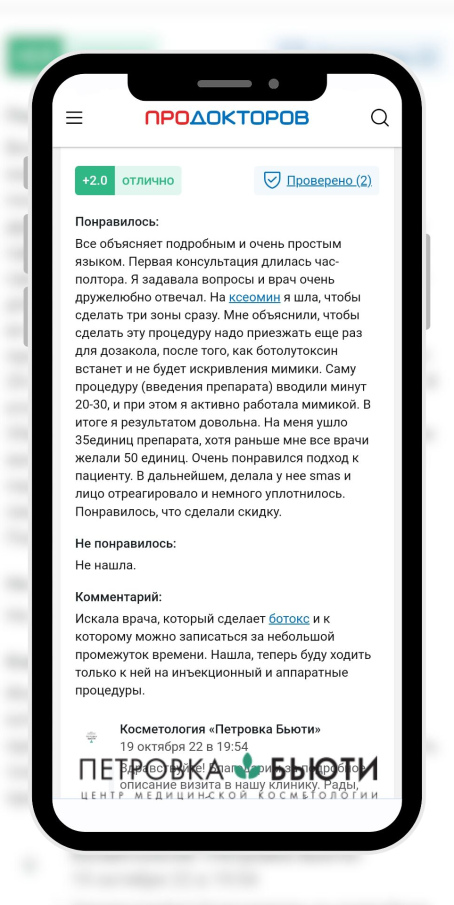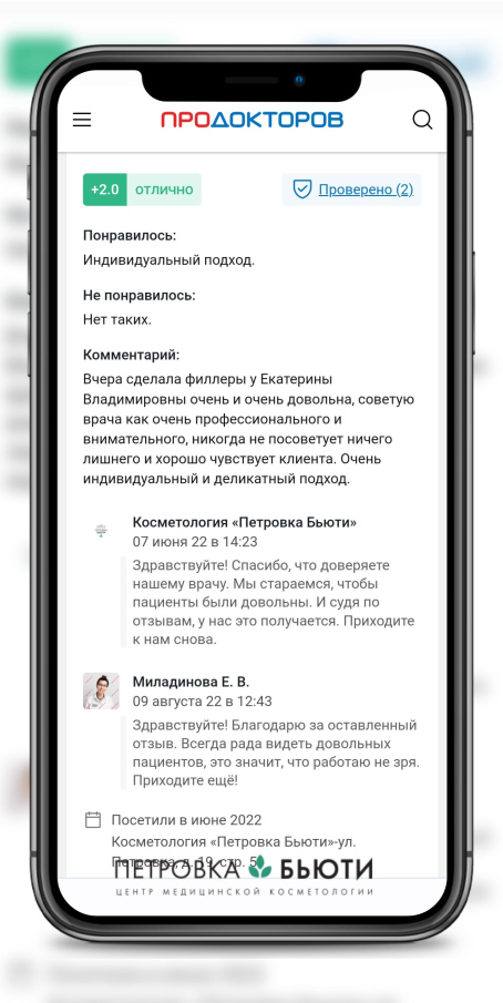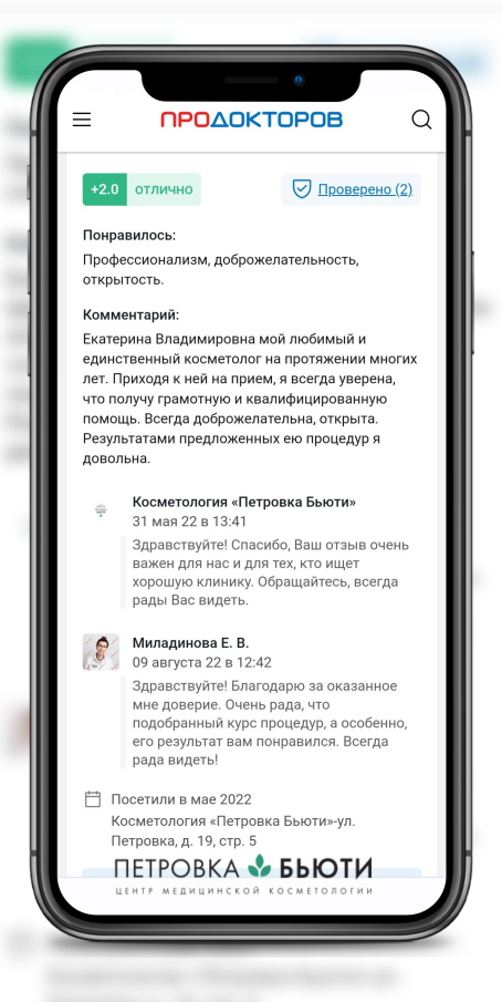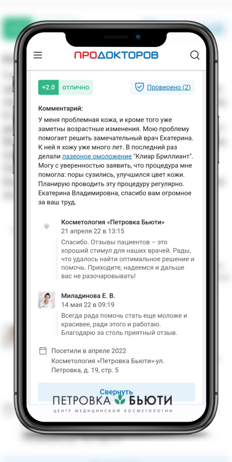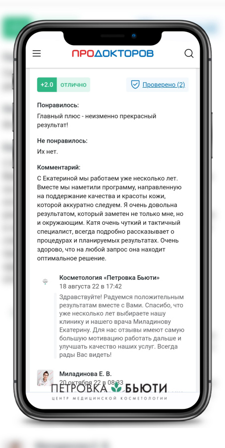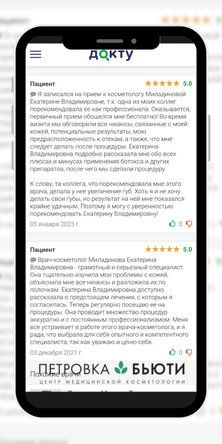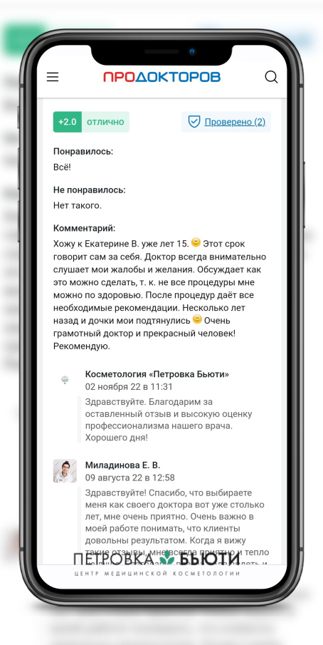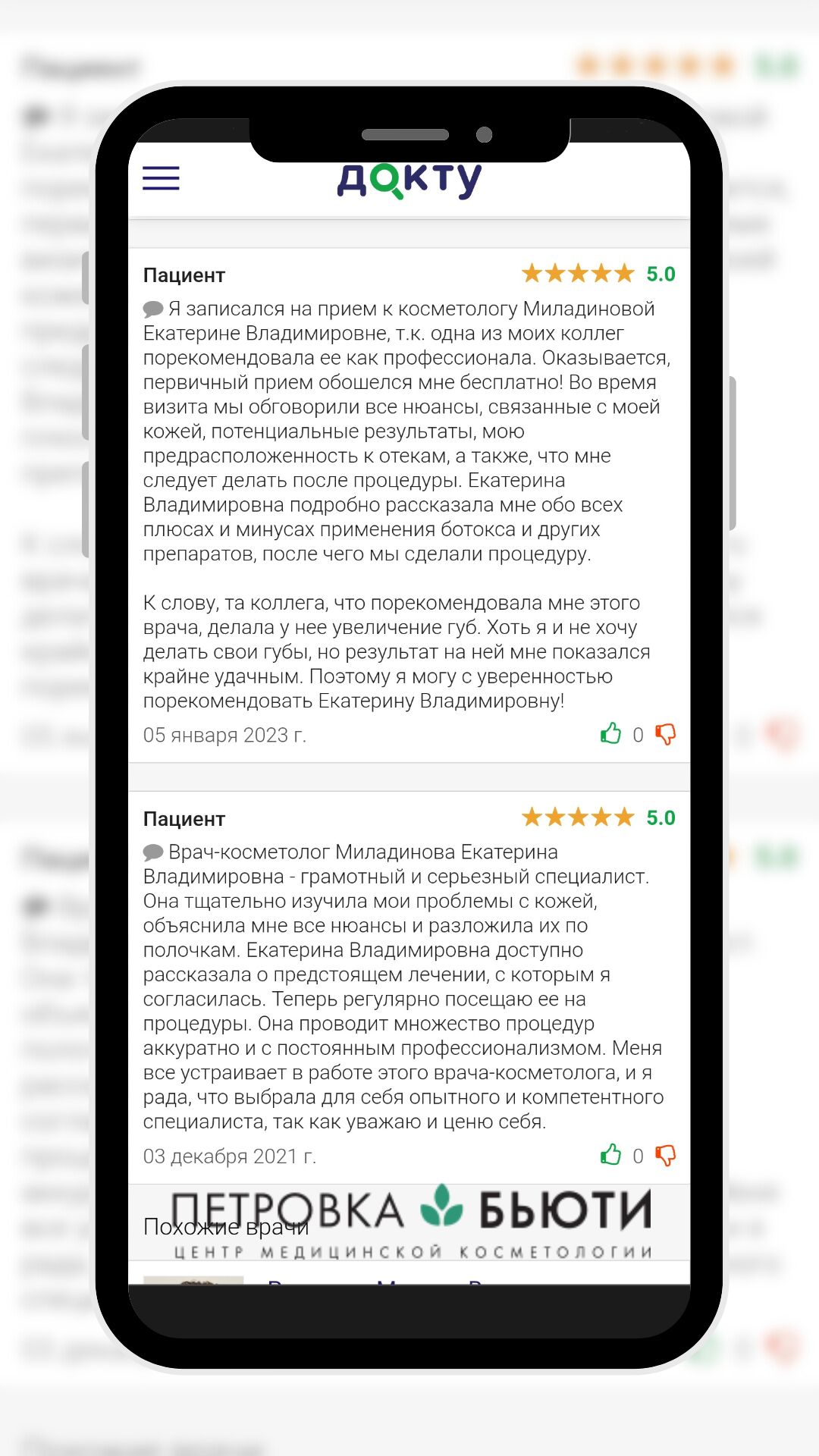 Здравствуйте! Мне делали процедуру "Чистка лица" + "Пилинг" в понедельник вечером, а уже в пятницу я была совершенно другим человеком. Большое спасибо врачу Миладиновой Екатерине Владимировне!
