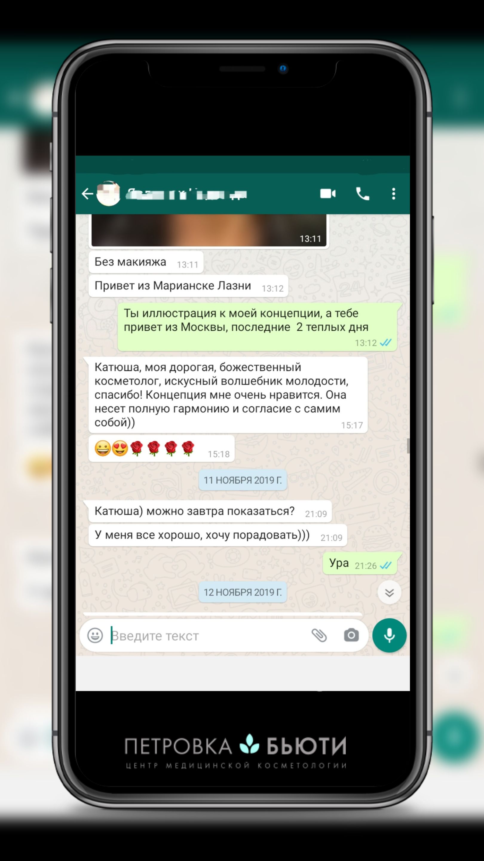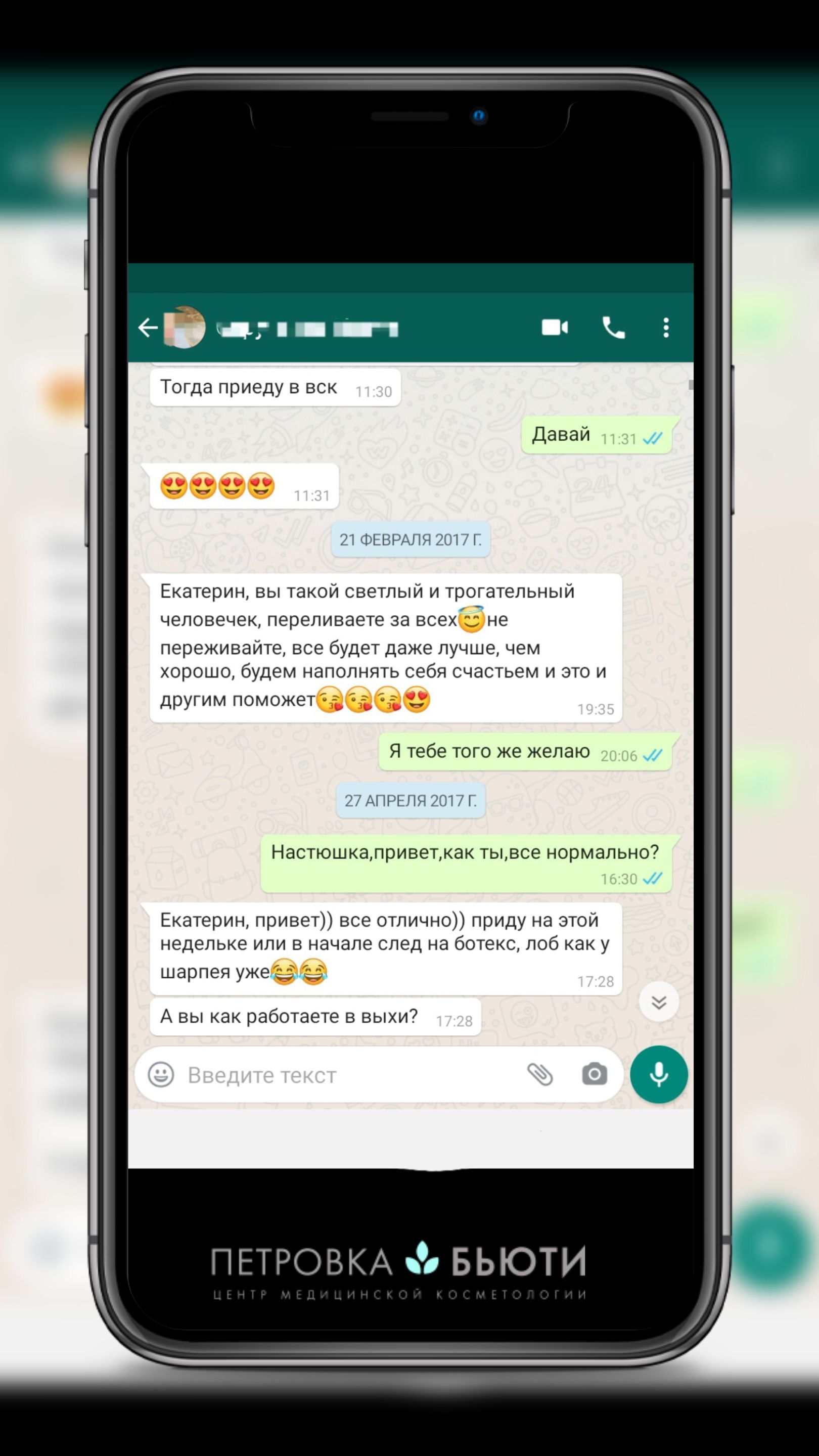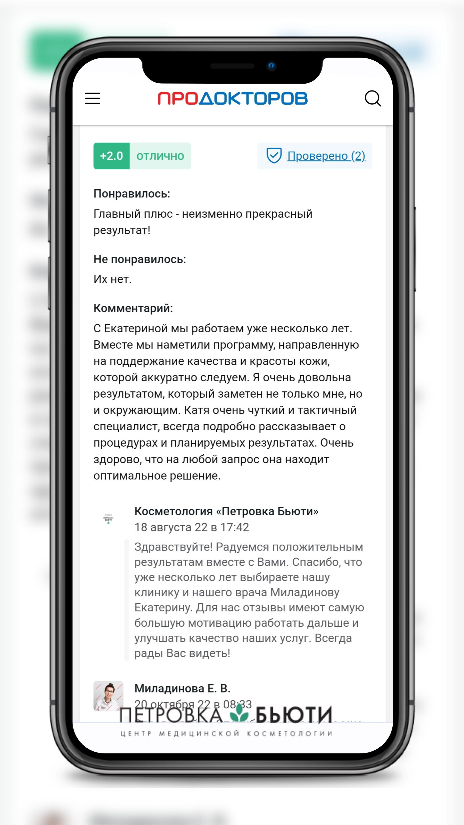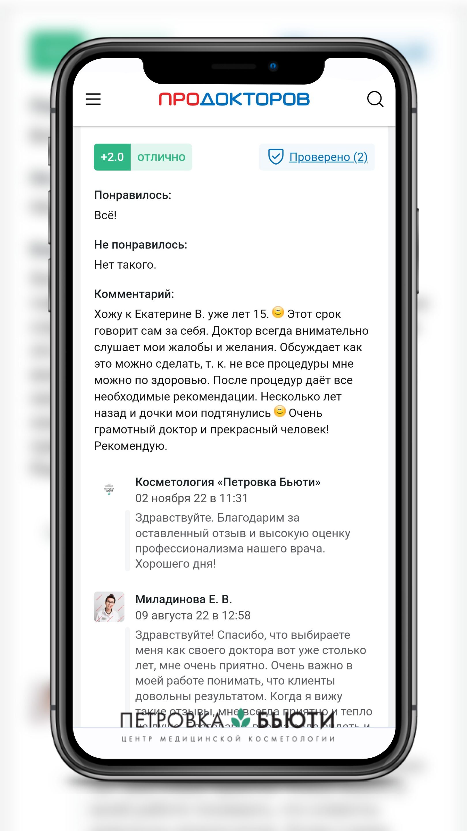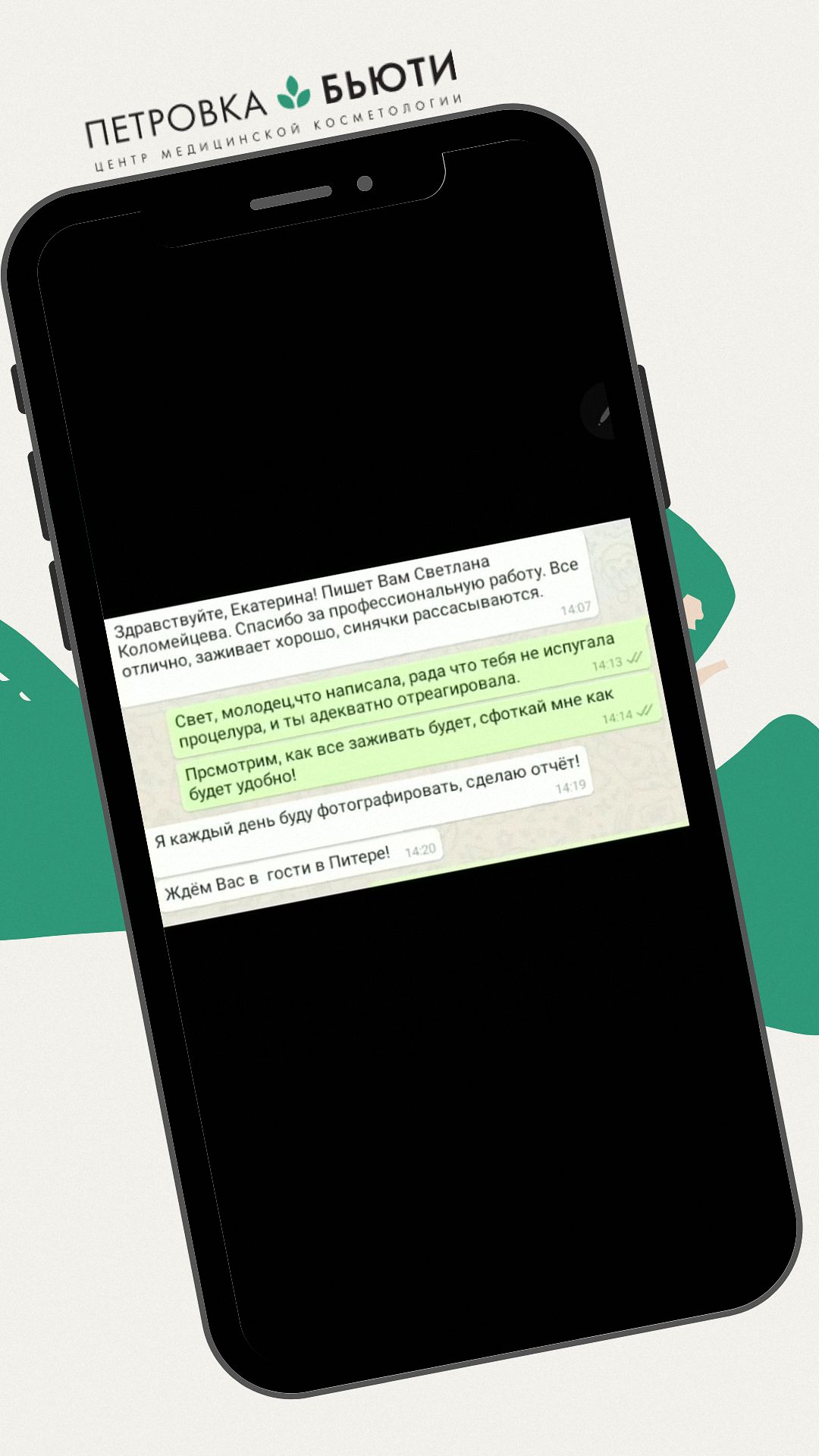 Мало того, что не страшно приходить на процедуры, было даже приятно, а главное - ты точно знаешь, что тебя ждет. Екатерина Владимировна - очень внимательный, чуткий и, главное, честный врач, который подробно отвечает на все вопросы, не утаивая ни плюсы, ни минусы. Благодаря этому, удалось подобрать лечение, которое действительно подходит моей коже и образу жизни. Прошло всего 3 недели с 1-ой процедуры, а мы уже получили результат, которого не удалось достичь в течение 10 лет самолечения. Еще раз большое спасибо Вашему центру и лично Екатерине Владимировне!