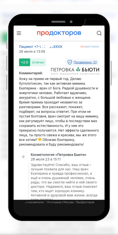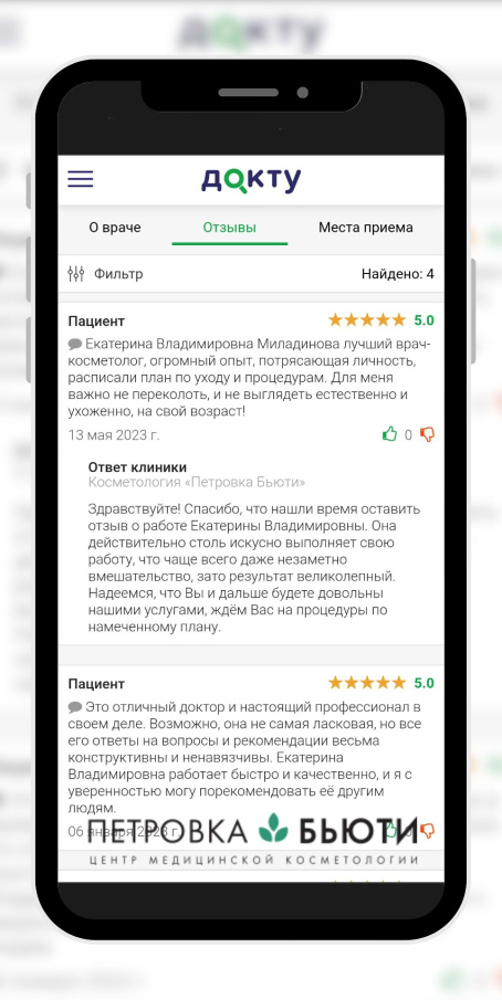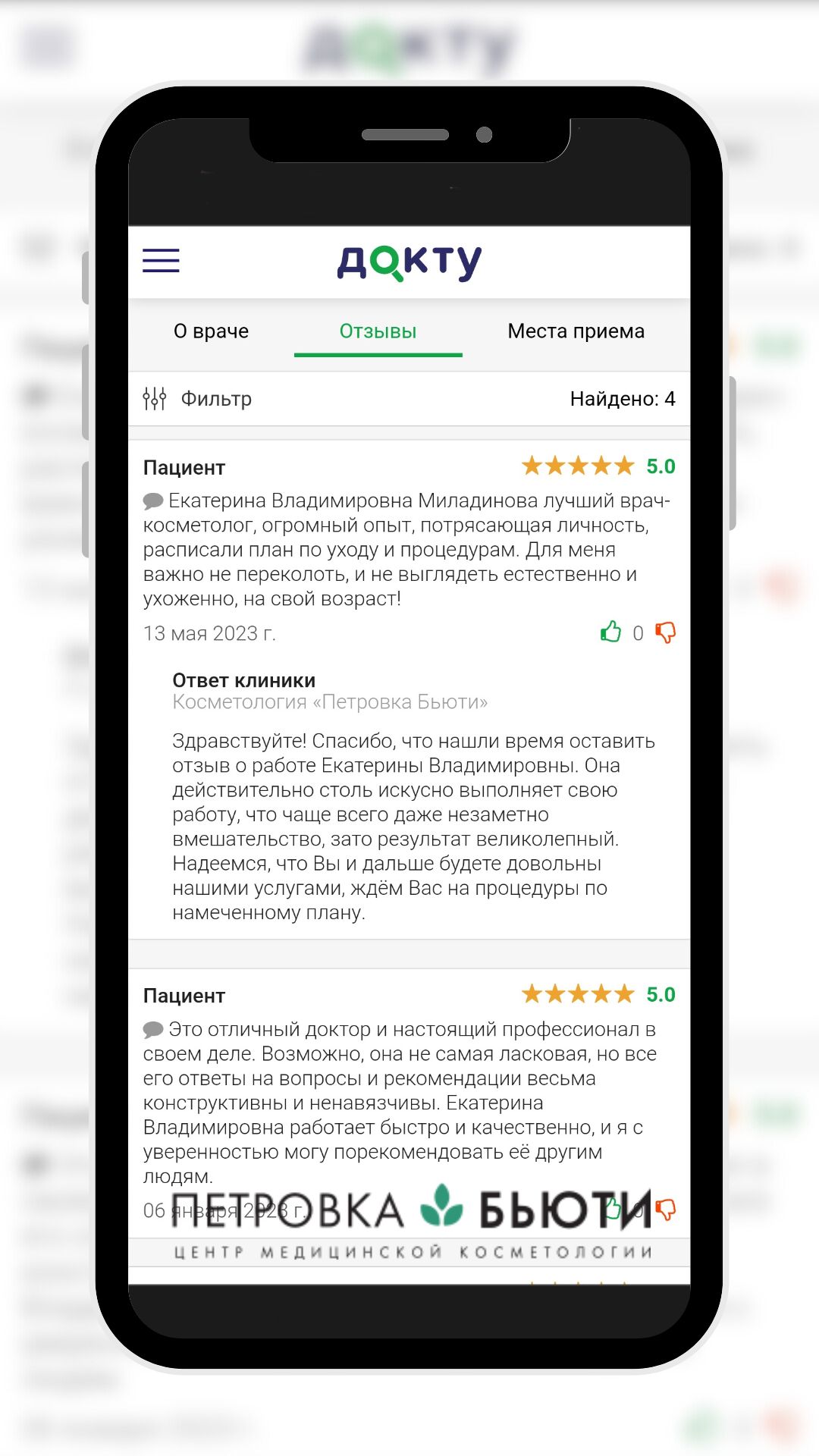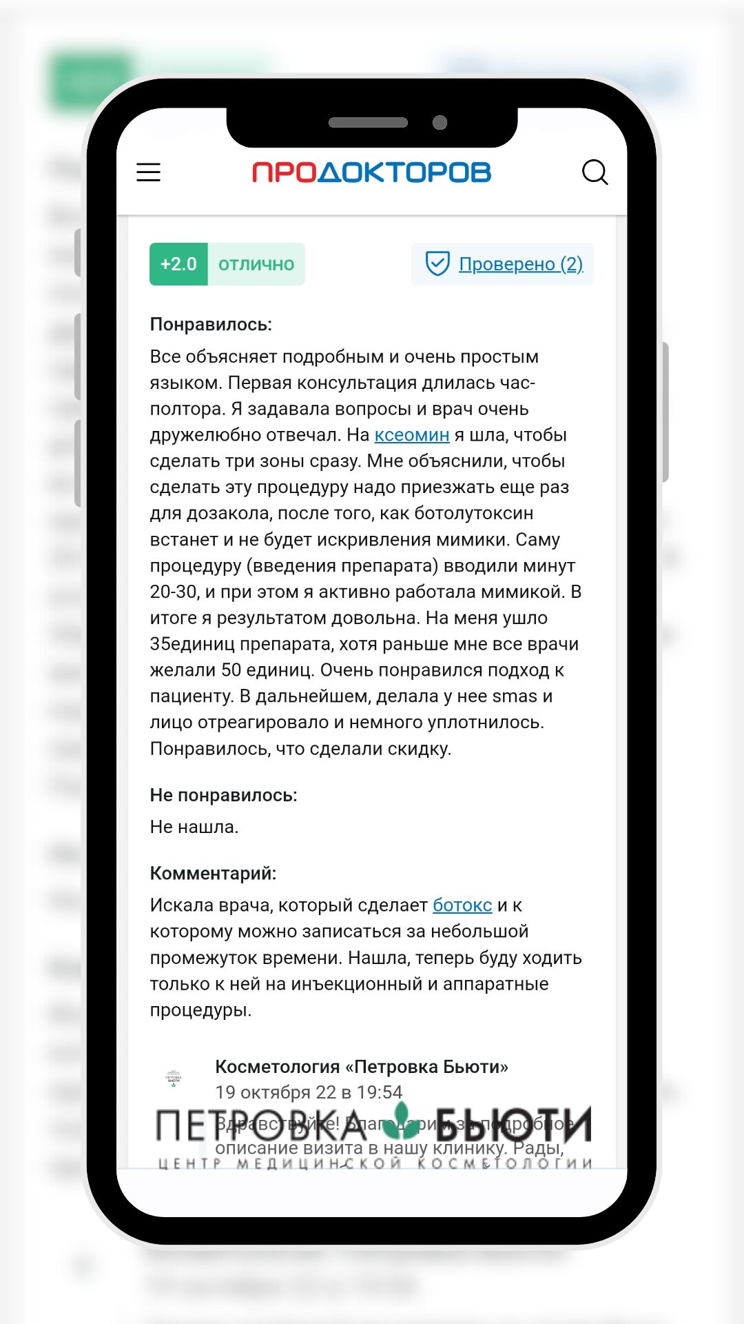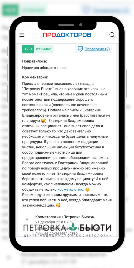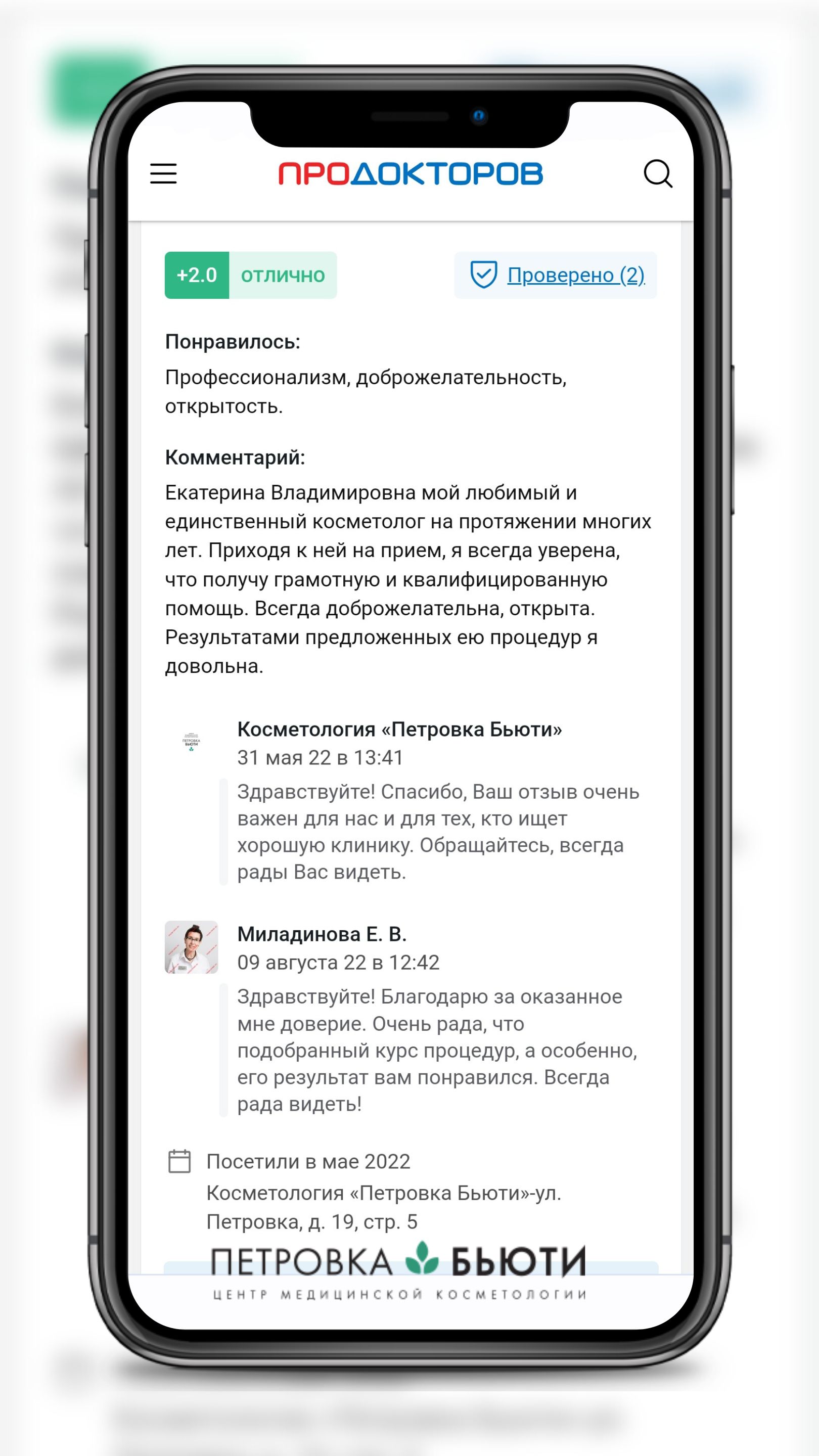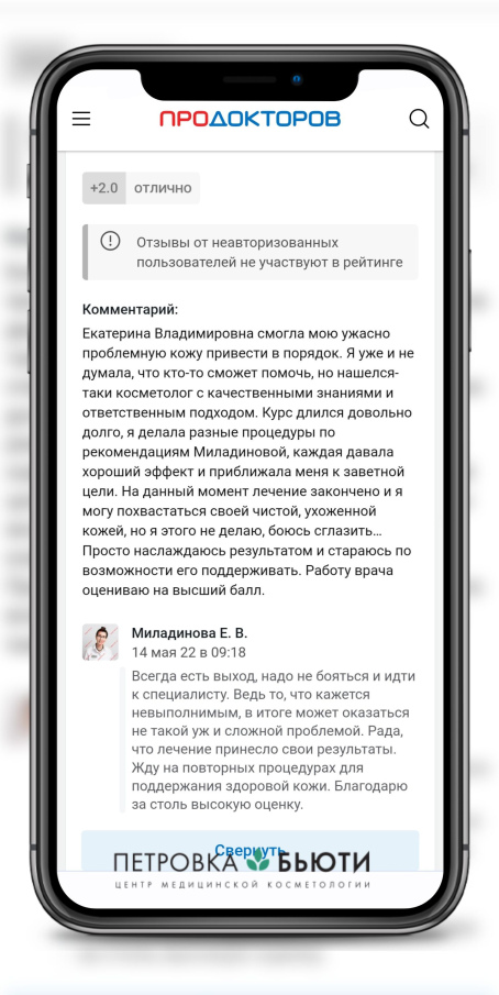 Мало того, что не страшно приходить на процедуры, было даже приятно, а главное - ты точно знаешь, что тебя ждет. Екатерина Владимировна - очень внимательный, чуткий и, главное, честный врач, который подробно отвечает на все вопросы, не утаивая ни плюсы, ни минусы. Благодаря этому, удалось подобрать лечение, которое действительно подходит моей коже и образу жизни. Прошло всего 3 недели с 1-ой процедуры, а мы уже получили результат, которого не удалось достичь в течение 10 лет самолечения. Еще раз большое спасибо Вашему центру и лично Екатерине Владимировне!