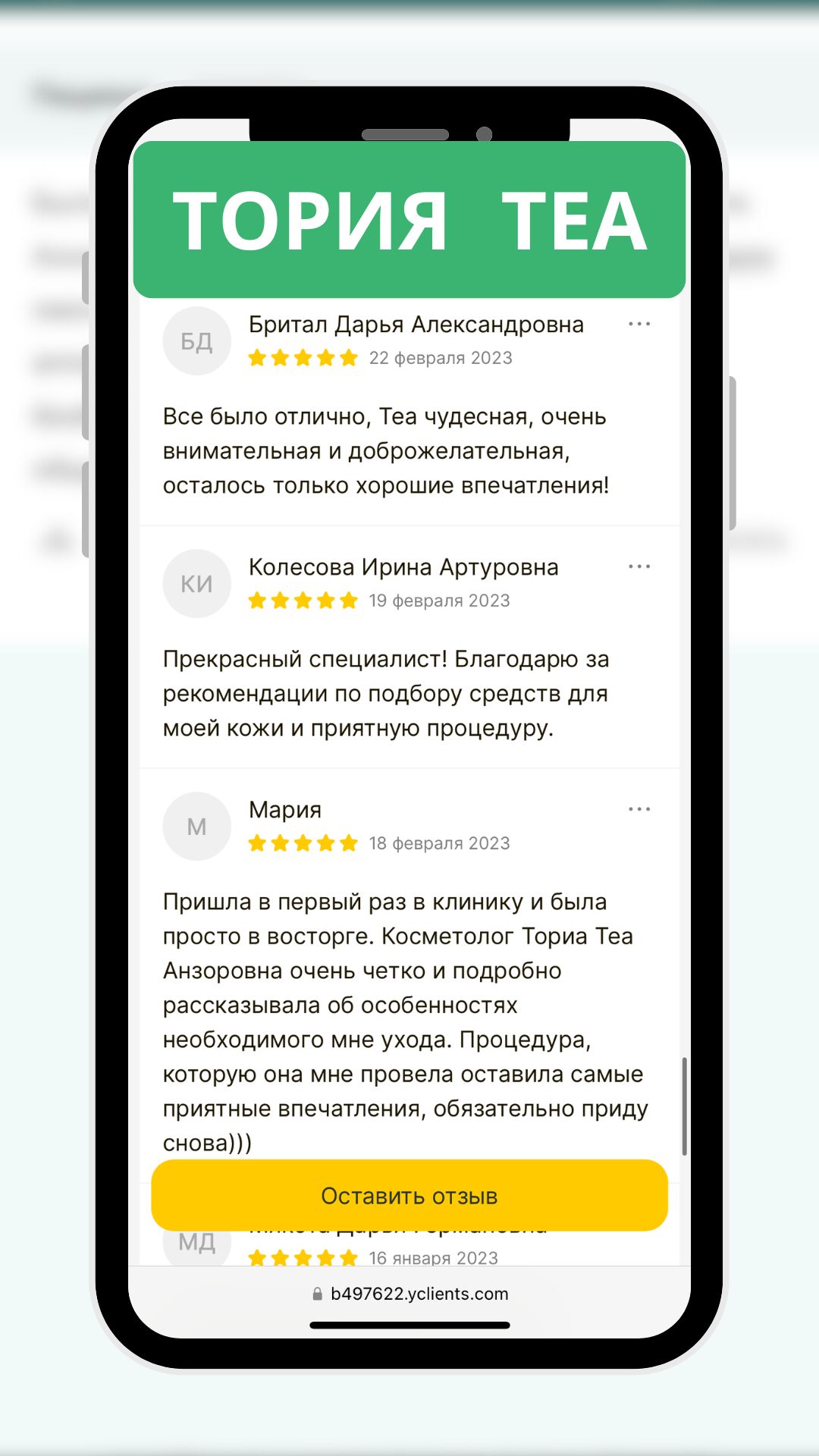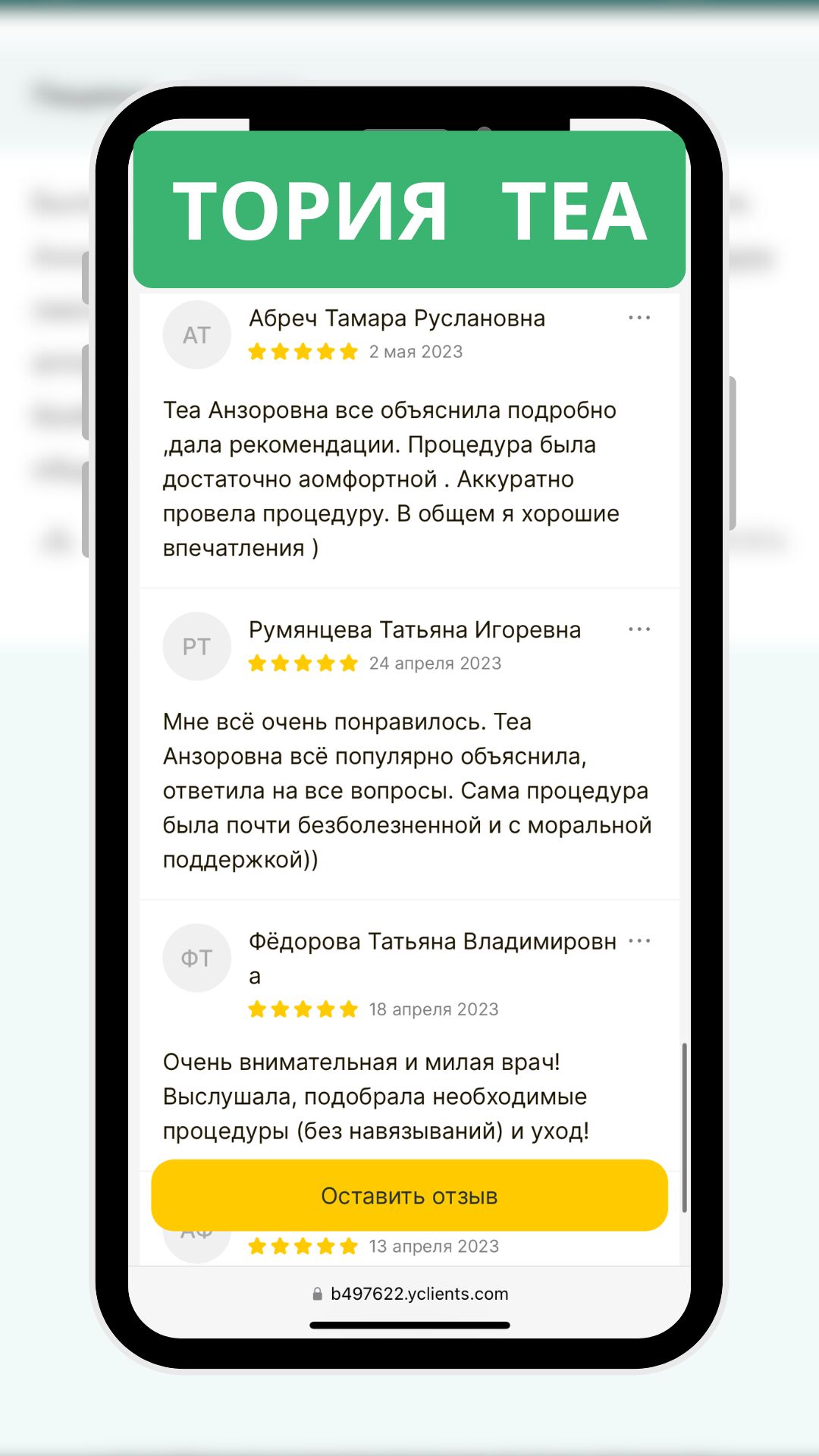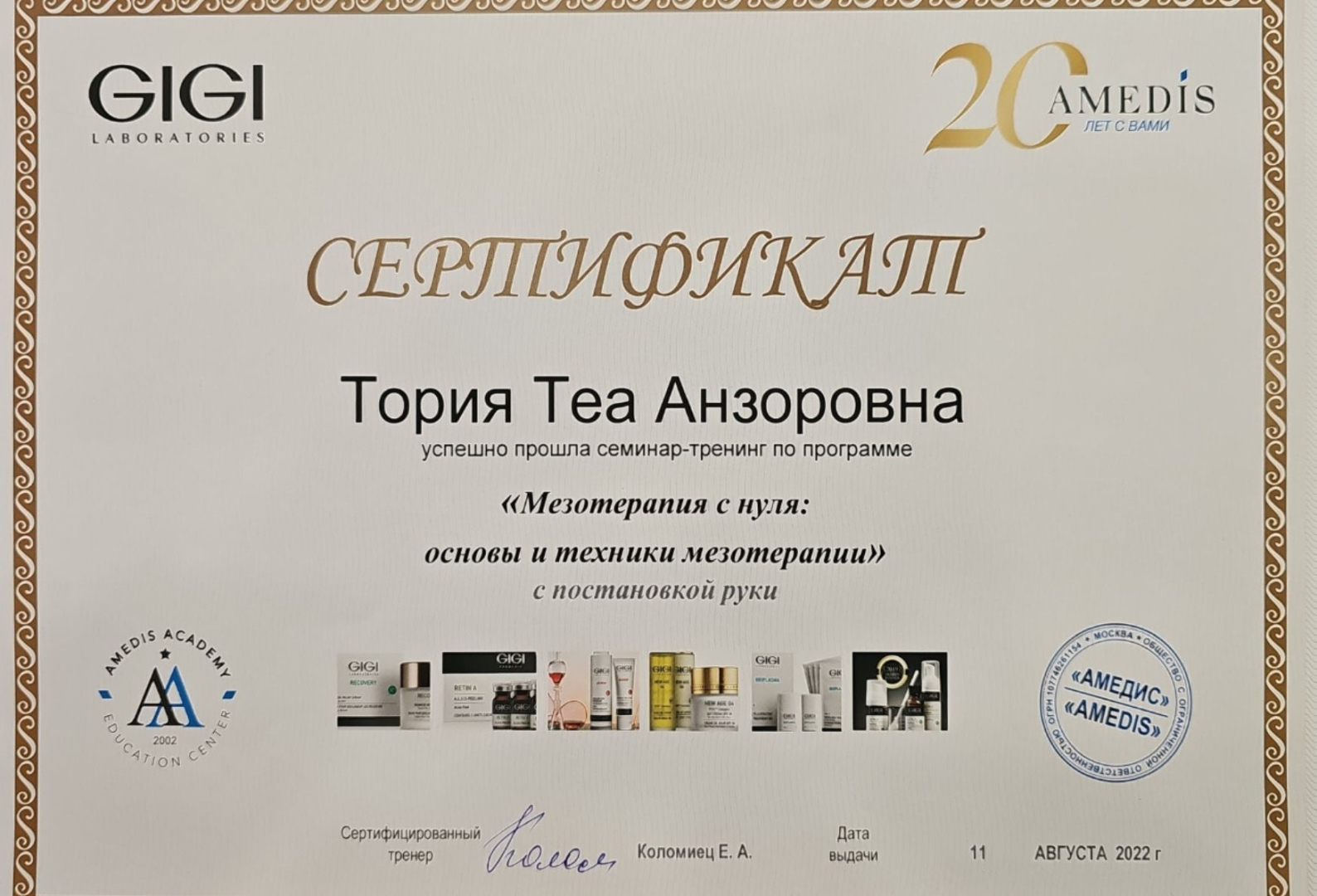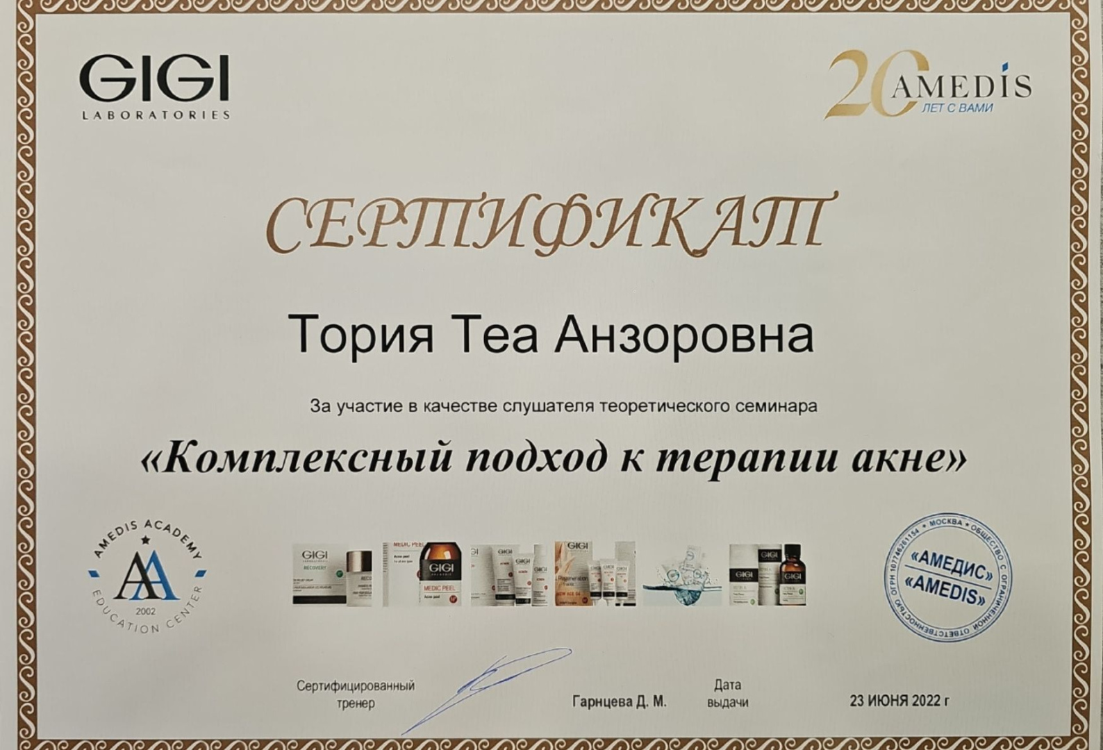 Тория Теа Анзоровна профессионально владеет аппаратными методиками лечения пигментации и сосудов, акне и удаления рубцов. Любит инъекционные методы и проводит ботулинотерапию, контурную пластику, биоревитализацию, и считает, что красивая кожа - это самое главное в привлекательности как женщин, так и мужчин.