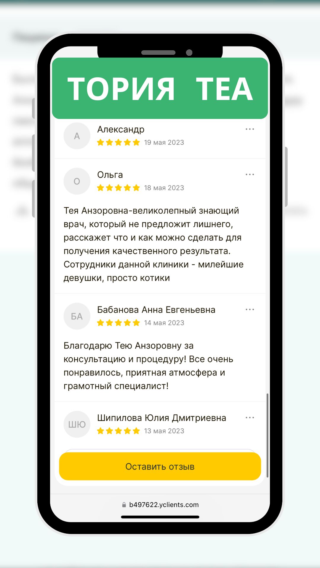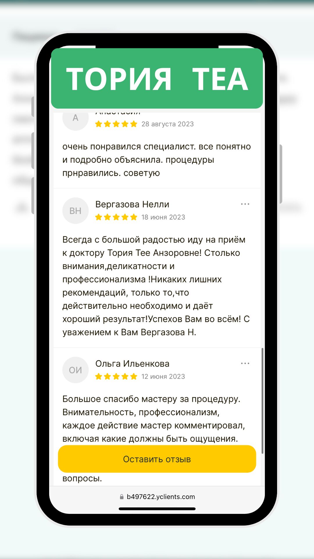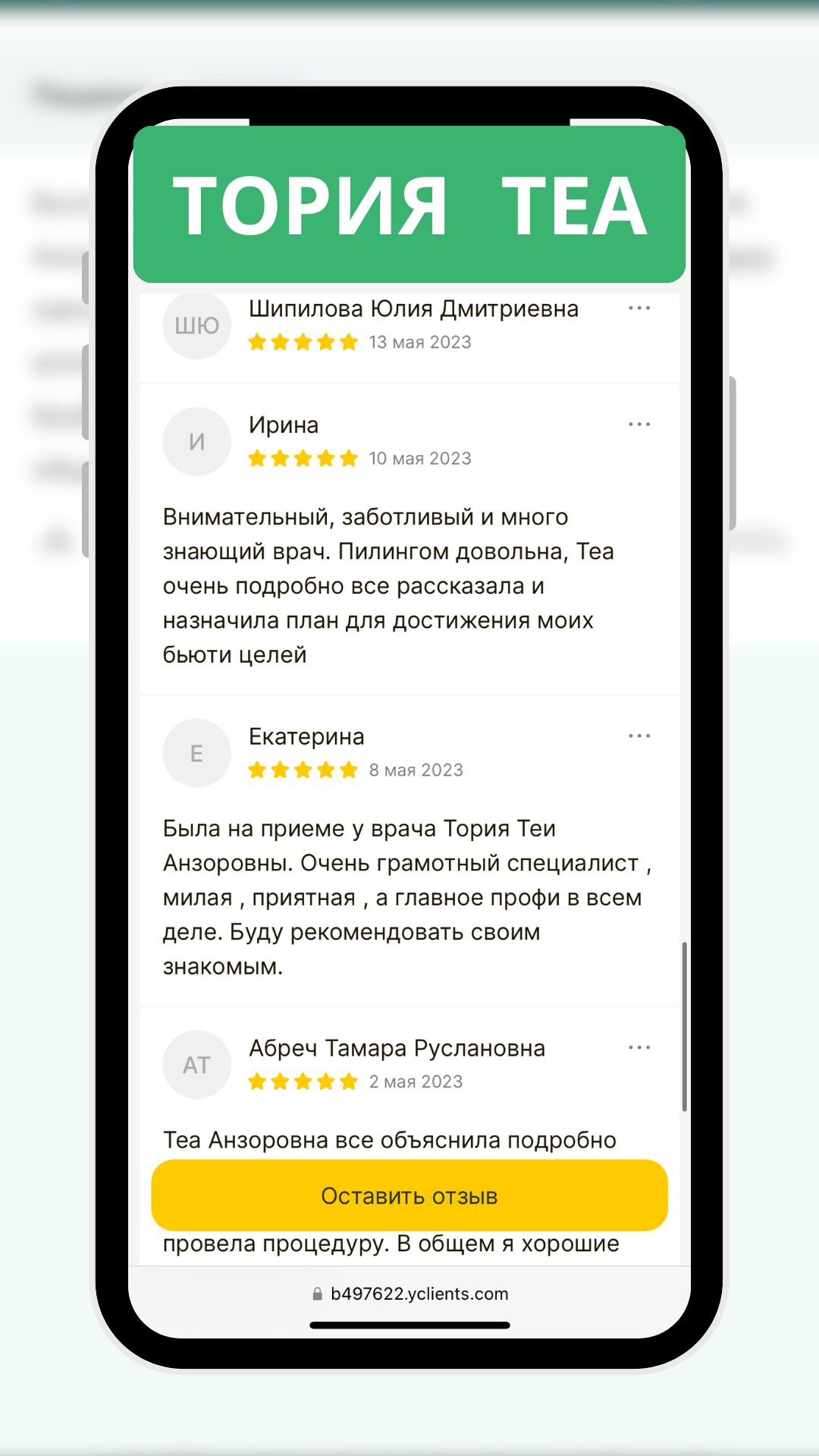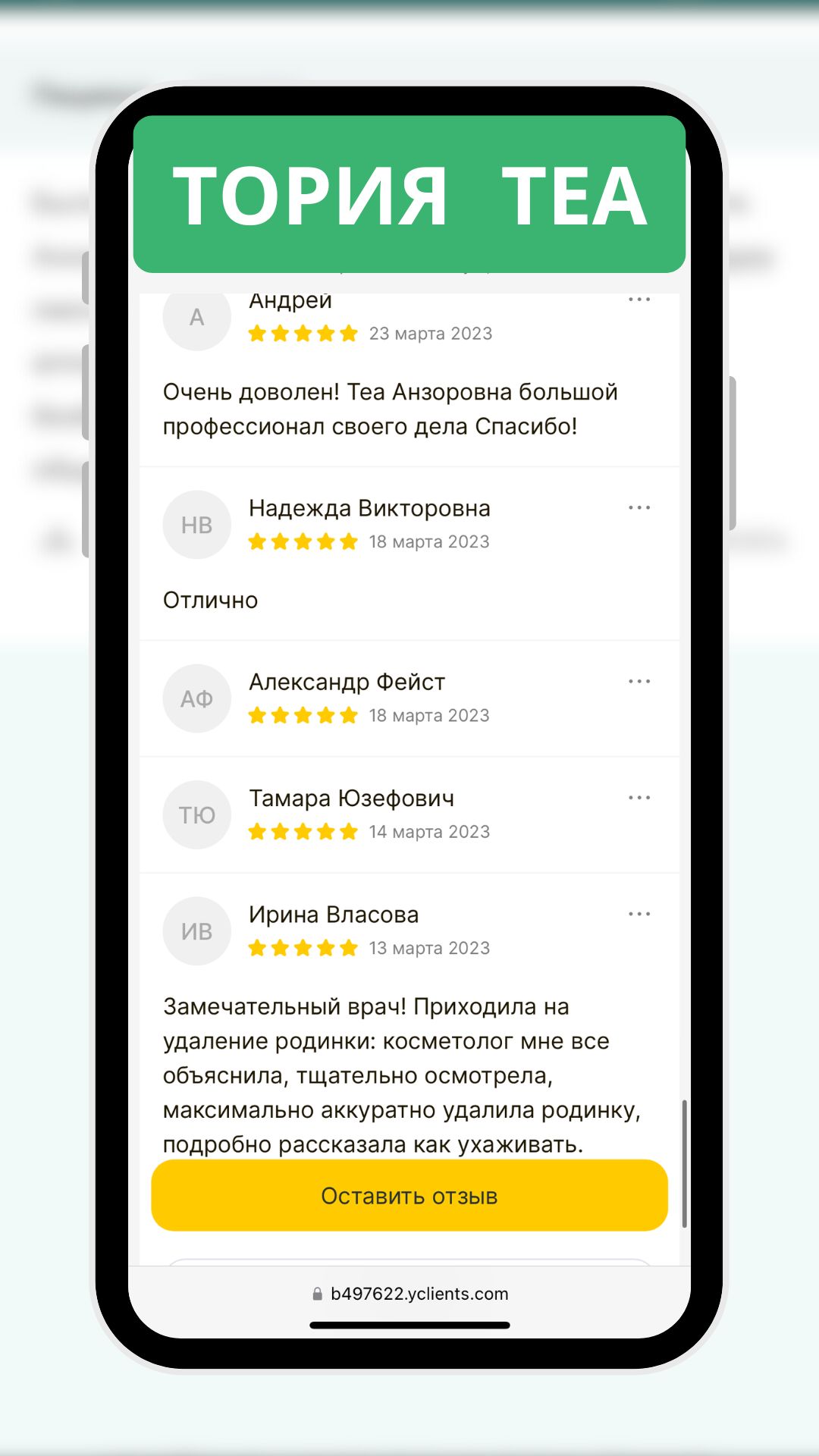 Тория Теа Анзоровна профессионально владеет аппаратными методиками лечения пигментации и сосудов, акне и удаления рубцов. Любит инъекционные методы и проводит ботулинотерапию, контурную пластику, биоревитализацию, и считает, что красивая кожа - это самое главное в привлекательности как женщин, так и мужчин.