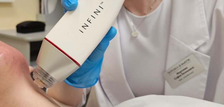 Лучше всего работает игольчатый RF-лифтинг на аппарате ИНФИНИ. В процессе процедуры используется насадка с микроиголочками с напылением из золота. Она проникает на глубину 3,5 мм, и этого более, чем достаточно, чтобы запустить процессы стимулирования коллагена. Клетки получают мощный импульс, который активирует факторы роста. Кроме этого создаваемые механические мини-проколы улучшают движение питательных полезных веществ в коже.