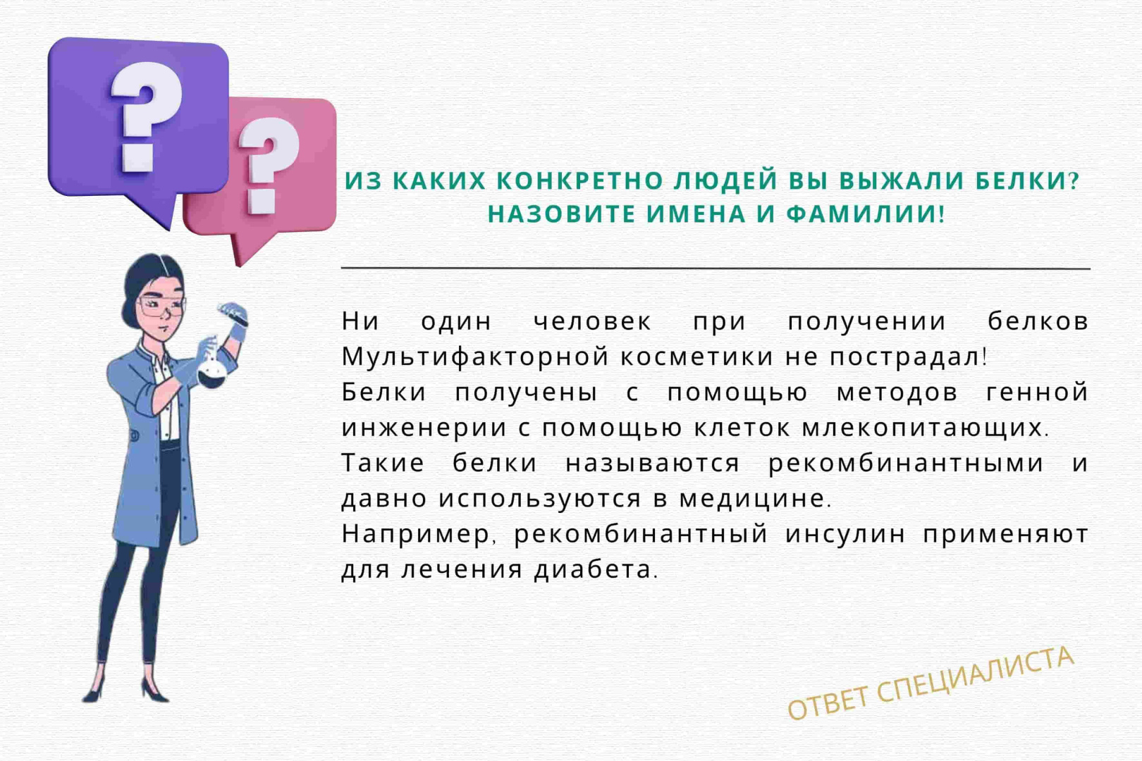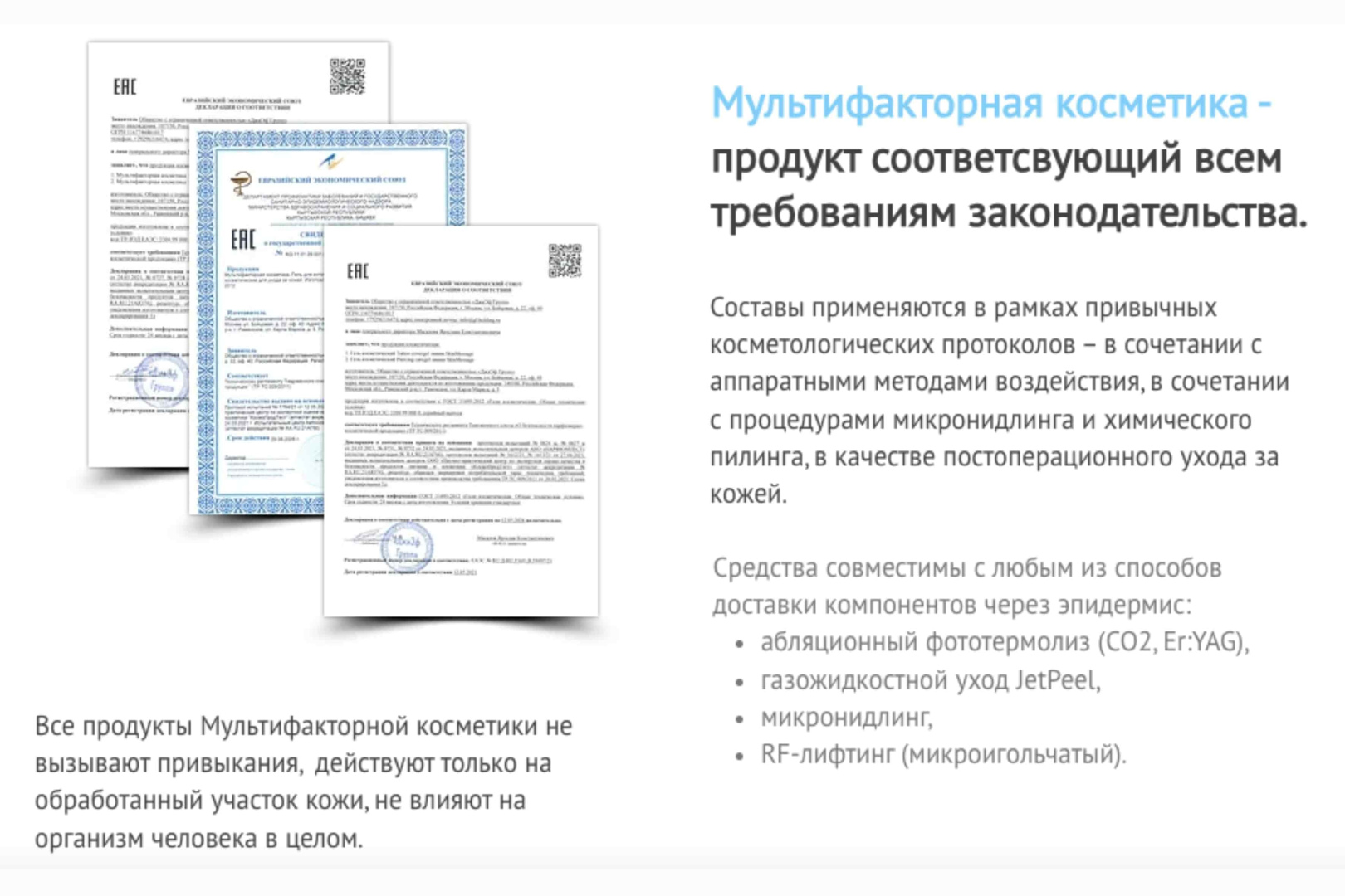 Все средства со специальными рекомбинантными белками прошли необходимые испытания в России. Они изготавливаются под контролем профессионалов в условиях проверенных и лицензированных лабораторий. Их безопасность подтверждена декларациями о соответствии продукции российским ГОСТам. Они