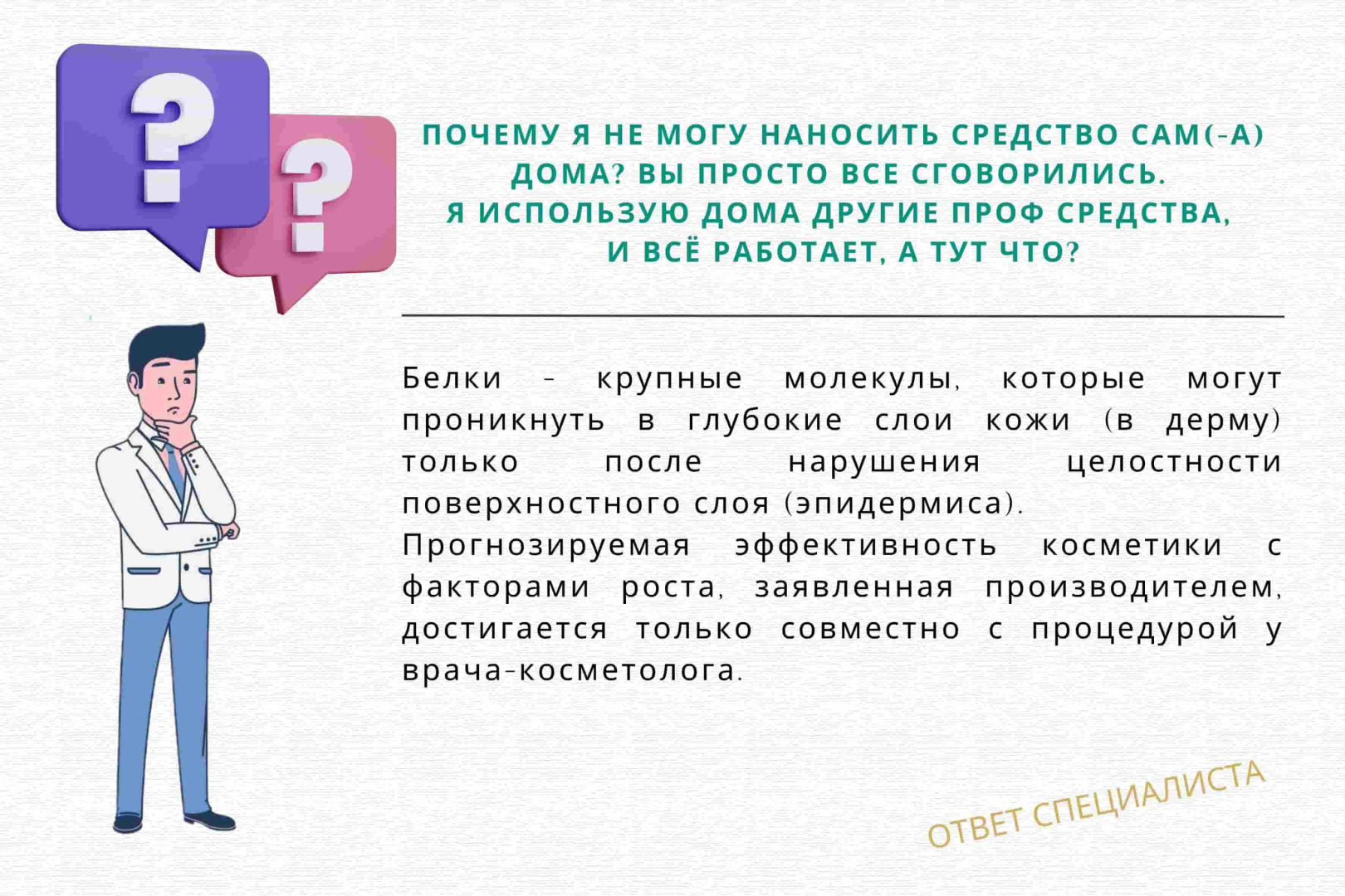 Это косметика нового поколения, которая затрагивает серьезные процессы работы клеток кожи. Поверхностное нанесение факторов роста в косметике – это как использование пептидов, хорошо, но не так эффективно, как применение после косметических процедур, облегчающих доступ.