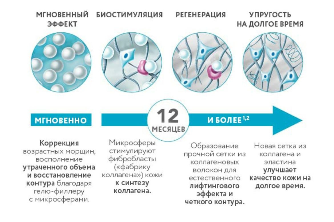 Попадая в дерму, микросферы препарата Radiesse мгновенно заполняют складки и выравнивают морщинки, но также провоцируют биостимуляцию, то есть активную выработку коллагена вокруг введенных микросфер.