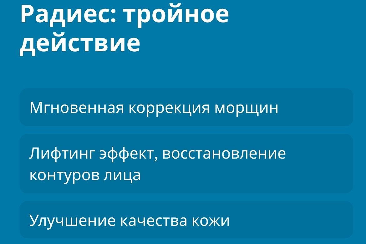 "Радиесс" (производство компании Merz Aesthetics) - уникальный препарат, который применяется в косметологии не только как филлер, но и как коллагеностимулятор. Он обеспечивает долговременную коррекцию морщин и пролонгированную подтяжку лица, помогая сохранить молодость и красоту.