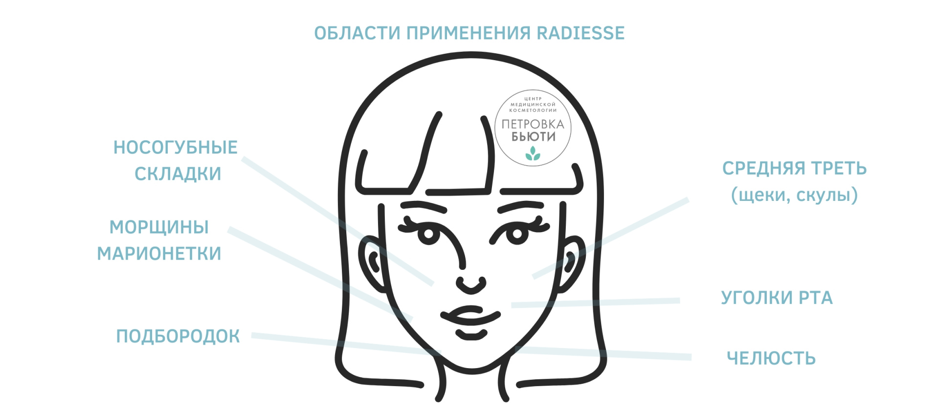 Независимо от зоны введения препарат Радиесс работает одинаково. Он стимулирует повышение упругости кожи и восполняет утрачиваемые с возрастом объемы.